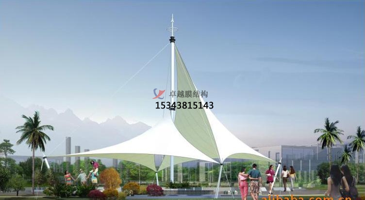 3.污漬:污漬也是在安徽張拉膜景觀中常見(jiàn)的疵病,特別是在早期選用PV膜材建成的一些張拉膜景觀.原因主要是在設(shè)于膜材外用PVC涂層隨時(shí)間推移老化/剝落所致.由于制作安裝缺陷導(dǎo)致膜面在焊接縫處留下污漬或不慎利物刮劃涂層,使織物直接接受紫外線的作用,時(shí)間久了也會(huì)出現(xiàn)局部污漬.