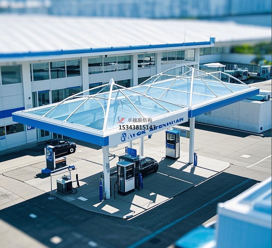 位于高速公路服務(wù)區(qū)的加油站,車流量大,對罩棚的功能性要求更高。某高速公路服務(wù)區(qū)加油站采用了大型的膜結(jié)構(gòu)罩棚,其跨度達(dá)到了 30 米,能夠同時(shí)為多輛大型貨車和小型汽車提供加油服務(wù)。膜結(jié)構(gòu)罩棚的抗風(fēng)性能在高速公路的強(qiáng)風(fēng)環(huán)境下得到了充分考驗(yàn),確保了加油站在惡劣天氣下的正常運(yùn)營。此外,膜材的透光性為夜間加油提供了良好的照明條件,減少了人工照明的能耗。