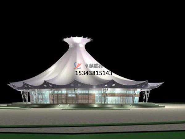 以膜材、鋼索及支柱構(gòu)成,利用鋼索與支柱在膜材中導(dǎo)入張力以達(dá)安 定的形式。除了可實踐具創(chuàng)意,創(chuàng)新且美觀的造型外,也是更能展現(xiàn)膜結(jié) 構(gòu)精神的構(gòu)造形式. 近年來,大型跨距空間也多采用以鋼索與壓縮材構(gòu)成鋼索網(wǎng)來支撐上部膜材的形式。因施工精度要求]高,結(jié)構(gòu)性能強(qiáng),且具豐 富的表現(xiàn)力,所以造價略高于骨架式膜結(jié)構(gòu)。