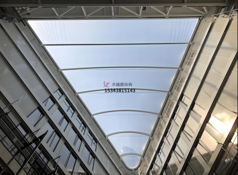 ETFE膜的出現(xiàn)為現(xiàn)代建筑提供了一個創(chuàng)新解決方案。由這種膜材料制成的屋面和墻體質(zhì)量輕,只有同等大小的玻璃質(zhì)量的1%;韌性好、抗拉強度高、不易被撕裂,延展性大于400%;耐候性和耐化學腐蝕性強,熔融溫度高達200℃,并且不會自燃。