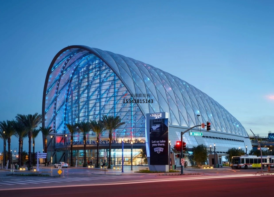 ETFE設計強度低,單層ETFE適用于跨度較小的結構,比較典型的應用是設置于桁架弦桿之間,形成采光帶,且通過ETFE與PVC/PTFE不同材質的組合使用,產生更為豐富的視覺效果。
