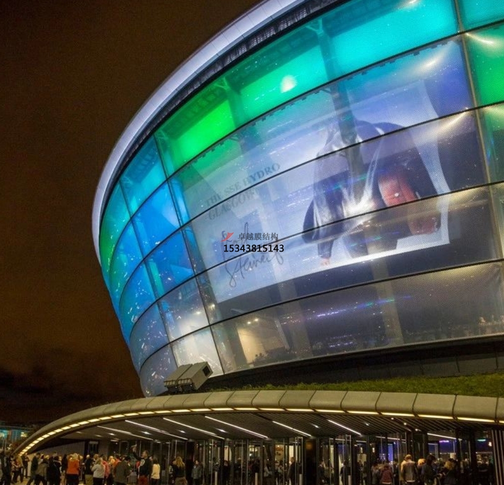 ETFF膜可以帶有印花圖案,印花圖案可有多種形式,在滿足視覺效果和遮陽要求的同時,還可保持幕墻的透明性,我們目前還可以做成鑲嵌式圖案(可更換),用于品牌及廣告展示。