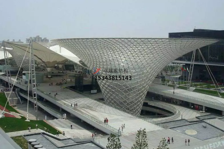 膜結(jié)構(gòu)是建筑結(jié)構(gòu)中更新發(fā)展起來的一種形式,它以性能優(yōu)良的織物為材料,或是向膜內(nèi)充氣,由空氣壓力支撐膜面,或是利用柔性鋼索或剛性支撐結(jié)構(gòu)將面繃緊,從而形成具有一定剛度、能夠覆蓋大跨度空間的結(jié)構(gòu)體系。自從1970年代以來, 膜結(jié)構(gòu)在國外已逐漸應(yīng)用于體育建筑、商場、展覽中心、交通服務(wù)設(shè)施等大跨度建筑中。膜結(jié)構(gòu)已成為結(jié)構(gòu)設(shè)計(jì)選型中的一個(gè)主要方案。成為化纖紡織品應(yīng)用的一個(gè)重要領(lǐng)域。近年來在中國建筑 結(jié)構(gòu)中也有長足的進(jìn)展。大阪萬國博覽會中的美國館采用了氣承式空氣 膜結(jié)構(gòu)。