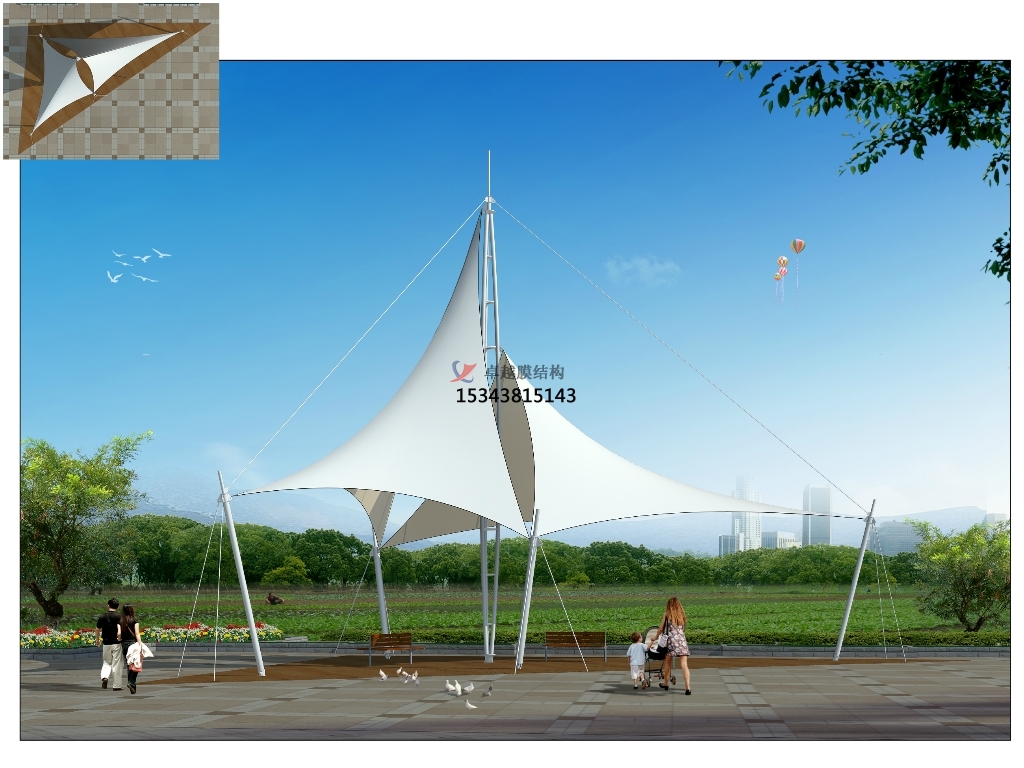 6、景觀設施:膜結構以其特殊的建筑表現手法,主要體現在造型、漫射透光性、豐富多彩,可廣泛應用于入口、標志性小品 、步行街、停車場等,其他建筑特性無須較高要求。