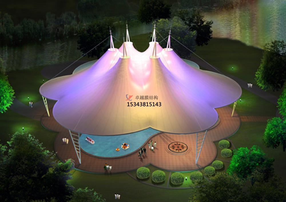 膜結(jié)構(gòu)景觀是一種全新的建筑結(jié)構(gòu)形式,它集建筑學(xué)、結(jié)構(gòu)力學(xué)、精細(xì)化工與材料科學(xué)、計算機技術(shù)等為一體,具有很高技術(shù)含量。其曲面可以隨著建筑師的設(shè)計需要任意變化,結(jié)合整體環(huán)境,建造出標(biāo)志性的形象工程。