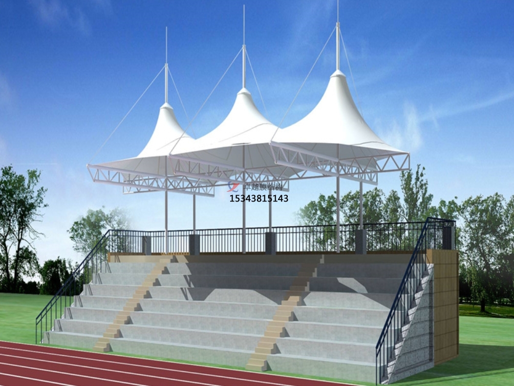 膜結構看臺廣泛用于大型體育館以及體育看臺的工程之中。作為一種大跨結構,自輕重通過膜所具鋼結構的拉力平衡,可實現超越距離懸挑。采用膜結構頂棚,符合了體育場館的視野寬闊、無結構遮擋的建筑要求,成為業(yè)主以及設計師首選結構形式。在膜結構體育看臺的類型中,經常會見到一種帽頂式的膜結構體育看臺,這種膜結構體育看臺帽頂的造型有什么特點呢?膜結構體育看臺帽頂施工時怎么安裝呢?