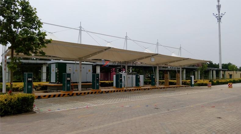 商業(yè)廣場雨棚搭建的篷布采用PVC/PVDF/PTFE/ETFE,而膜材的更大特點(diǎn)是強(qiáng)度高、耐久性好、防火難燃、自潔性好,不受紫外線影響,使用壽命長,一般15-30年。具有高透光率,透光率為13%,對熱能反射率73%,熱吸收量很少。正是因?yàn)檫@種劃時代的膜材料的發(fā)明,使商業(yè)廣場雨棚搭建成為現(xiàn)代化的永久建筑。