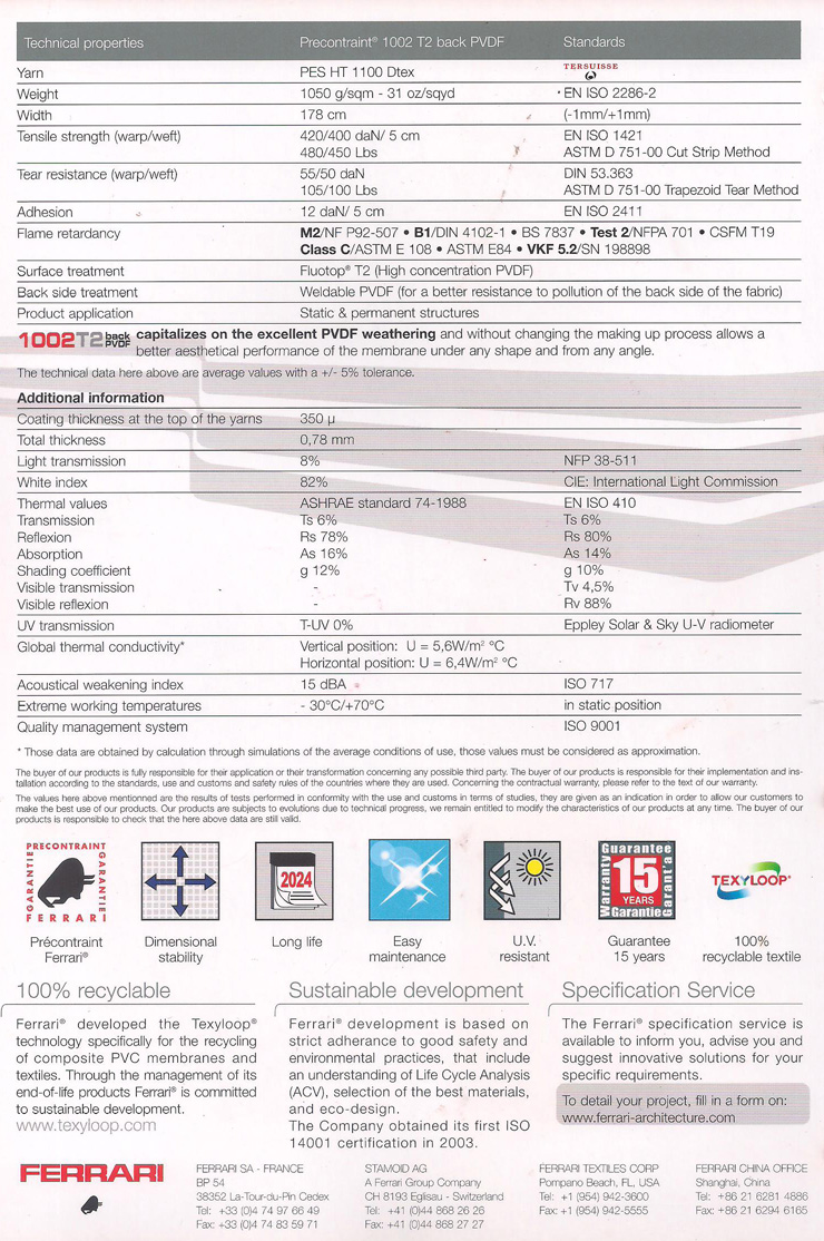 FLUOTOPT膜材的表面處理確??椢锝Y(jié)構(gòu)的永恒持久。表面現(xiàn)象100%PVDF涂層對于抗大氣污染,耐臟及抗惡劣氣候等方面成效卓著。FLUOTOP T表面處理為法拉利很好的工藝,并嫁接入涂層內(nèi),確保這一復(fù)合材料融為一體,均勻恒質(zhì)。預(yù)應(yīng)力FLUOTOP T復(fù)合膜材保證織物建筑具有極可靠的物理機(jī)械性能,更理想的半透明狀態(tài)及外形的卓越美感。