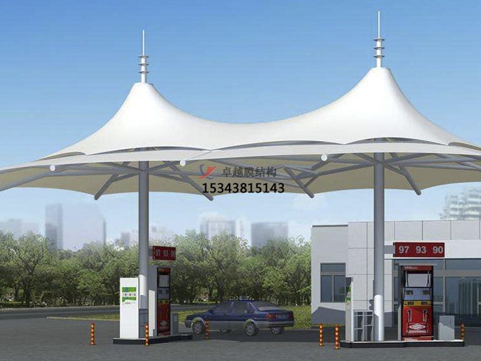 尖頂加油站張拉膜結(jié)構(gòu)效果圖展,常見的加油站張拉膜結(jié)構(gòu)是尖頂?shù)木佣?,白色pvc材質(zhì)的膜也是居多,看上去干凈整潔,而且是阻燃材料,防火,防潮,使用周期久,易于護(hù)理和維護(hù),也是成為眾多加油站的不二之選。