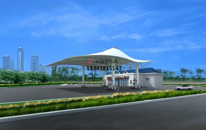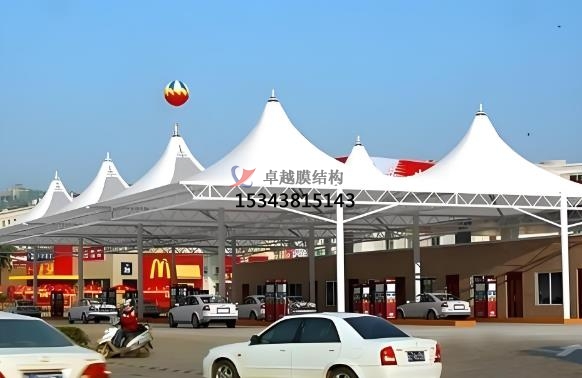 加油站張拉膜特點:造型美觀,透光性好,節(jié)能環(huán)保,抗震性強,施工便捷,經(jīng)濟性好。張拉膜結(jié)構(gòu)可通過獨特的曲面造型和豐富色彩,為加油站營造出現(xiàn)代、時尚的外觀,與周邊環(huán)境相融合,成為城市景觀的一部分。膜材具有較高的透光率,一般在 10%-20% 左右,部分可達 30% 以上,可提供自然采光,減少白天人工照明需求,節(jié)約能源。透光膜材可引入自然光減少照明能耗,結(jié)合自然通風(fēng)設(shè)計降低空調(diào)使用率,材料可回收性符合綠色建筑標準,張拉膜具有良好的保溫隔熱性能,能有效降低加油站內(nèi)部能耗,配合節(jié)能照明設(shè)備,可實現(xiàn)綠色環(huán)保目標。自重輕、柔性大,在風(fēng)荷載、雪荷載等外部荷載作用下,能通過變形分散荷載,具有良好的抗震性能,可抵抗 8 級地震。加油站膜結(jié)構(gòu)大部分構(gòu)件在工廠預(yù)制完成,現(xiàn)場組裝和安裝速度快,施工周期可比傳統(tǒng)建筑方式縮短一半以上,且對環(huán)境影響小,膜材料重量輕但強度高,降低支撐結(jié)構(gòu)負荷,安裝周期短,減少對加油站運營的影響。張拉膜結(jié)構(gòu)廣泛應(yīng)用于加油站頂棚設(shè)計,覆蓋加油區(qū)和洗車區(qū)域,為車輛及人員提供遮陽、防雨、防雪的全天候保護。在高速公路服務(wù)區(qū)、城市主干道等車流量密集區(qū)域,部分加油站結(jié)合張拉膜結(jié)構(gòu)擴展服務(wù)功能,例如設(shè)置司機休息區(qū)、戶外餐飲區(qū)或小型便利店,通過靈活的空間布局提升用戶體驗,其高效覆蓋能力尤為突出。雖然膜材和鋼結(jié)構(gòu)等材料成本相對較高,但由于施工周期短、維護成本低,長期來看綜合成本具有優(yōu)勢,且使用壽命可達 15-30 年甚至更長。