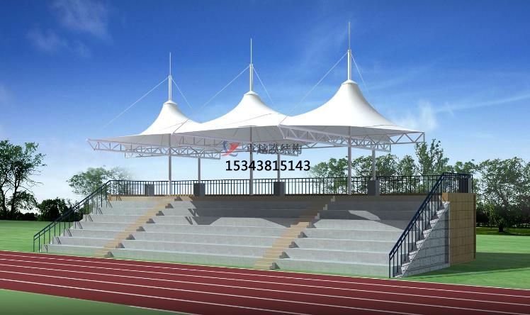 看臺張拉膜的功能:遮陽擋雨,環(huán)保節(jié)能,安全可靠,靈活定制??磁_張拉膜為觀眾提供了寬敞舒適的坐席,膜材透光性可提供所需照度,實現(xiàn)自然采光與人工采光結(jié)合,節(jié)省照明能耗,且夜間在燈光映射下形成絢麗景觀,同時具備遮陽擋雨的功能,確保在各種天氣條件下都能提供良好的觀賽體驗。采用可回收材料,生產(chǎn)消耗資源少,能反射陽光降低內(nèi)部溫度,減少空調(diào)使用,符合綠色建筑理念。由于其輕質(zhì)特性,看臺張拉膜對基礎(chǔ)的需求較低,減少了建筑材料的消耗,高質(zhì)量張拉膜強(qiáng)度高、抗腐蝕性能佳,能抵御紫外線、風(fēng)霜雨雪等自然因素影響,長期使用無需頻繁大規(guī)模耗資維修保養(yǎng)。看臺張拉膜結(jié)構(gòu)設(shè)計要求合理安全,首先應(yīng)用支承結(jié)構(gòu)的穩(wěn)定性,方便張拉膜面時把握控制點空間位置及實施張拉,膜材撕裂時不至于結(jié)構(gòu)整體倒塌,更換膜面施工方便。然后利用水平力的傳遞,采用合適構(gòu)造措施確保作用于膜面的荷載以膜面張力形式通過邊界索經(jīng)膜角節(jié)點板傳遞到支承結(jié)構(gòu)或基礎(chǔ)時,水平力可靠傳遞。其次利用結(jié)構(gòu)體系內(nèi)力的自平衡,將支承結(jié)構(gòu)體系設(shè)計成自平衡體系,減少膜面張力對下部結(jié)構(gòu)或地基的影響。最后根據(jù)結(jié)構(gòu)單元的重復(fù)與組合,利用基本外形的機(jī)構(gòu)單元組合形成大面積覆蓋空間時,注意膜面的熱合線在連接處要對齊,形成連續(xù)、流暢視覺效果。膜材料和支撐構(gòu)件經(jīng)嚴(yán)格檢測認(rèn)證,設(shè)計施工考慮防火、防腐蝕等安全因素,結(jié)構(gòu)穩(wěn)定性好,發(fā)生意外坍塌危險性小??磁_張拉膜可以根據(jù)具體需求進(jìn)行量身定制,適應(yīng)各種形狀和尺寸,完美契合不同場合。