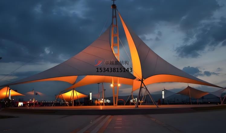 張拉膜景觀的應(yīng)用場景:商業(yè)空間,文化設(shè)施,運動場地,旅游景點。在商業(yè)空間中,如購物中心、商業(yè)廣場的入口、中庭等,可吸引顧客目光,提升商業(yè)氛圍。在文化設(shè)施中博物館圖書館等文化場所,可營造開放、溫馨的室內(nèi)環(huán)境,增添文化藝術(shù)氣息。在運動場地中足球場、籃球場等運動場館的屋頂或看臺,實現(xiàn)大跨度覆蓋,為觀眾和運動員提供良好的空間環(huán)境。在旅游景點景區(qū)大門、游客服務(wù)中心、觀景臺等,可彰顯地域特色,為游客提供遮陽避雨的空間。張拉膜景觀材料可在工廠預(yù)制,現(xiàn)場安裝快速高效,大大縮短施工周期。這種結(jié)構(gòu)通常采用預(yù)應(yīng)力拉索體系,利用邊鎖的拉力和膜材的形狀構(gòu)成造型,盡可能減少結(jié)構(gòu)體型對膜材視覺的影響常用彩色膜材以體現(xiàn)其千變?nèi)f化的浪漫情懷。其靈活的設(shè)計和組合方式,使其能夠適應(yīng)各種復(fù)雜的地形和環(huán)境。張拉膜景觀在設(shè)計中,會充分結(jié)合當(dāng)?shù)氐臍夂颉⒕坝^和文化背景,使其不僅具有功能性,還能成為地域文化的象征,提升旅游地區(qū)的品質(zhì)形象。此外,張拉膜材料本身具有顯色性,在夜間彩燈的映射下能形成絢麗繽紛的景觀效果,為人們帶來時尚、輕松的休閑感受。