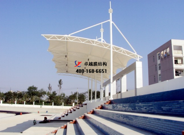 膜結(jié)構(gòu)看臺,周口體育場膜結(jié)構(gòu)看臺頂棚,膜結(jié)構(gòu)看臺雨棚,操場主席臺遮陽棚等張拉形式膜結(jié)構(gòu)的先行者是德國的奧托(F.Otto),他在1955年設計的張拉膜結(jié)構(gòu)跨度在25m左右,用于聯(lián)合公園多功能展廳。