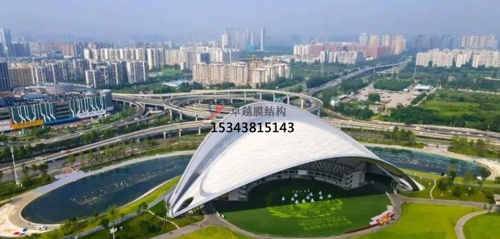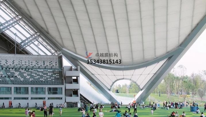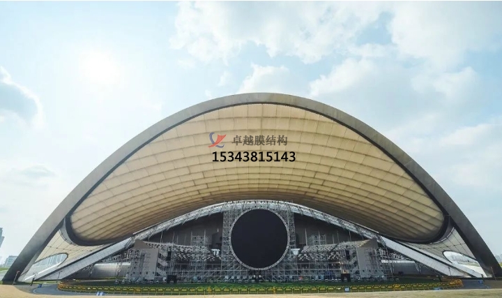 獨(dú)立罩棚屋面采用“索網(wǎng)+膜結(jié)構(gòu)”,自重輕,大幅減輕了主拱的荷載負(fù)擔(dān)。膜結(jié)構(gòu)分內(nèi)外兩層,起遮蔽作用的外層為PVDF膜,內(nèi)膜為網(wǎng)格膜材。值得一提的是,內(nèi)膜形成超過5000平方米的沉浸式可投影穹頂天幕,國內(nèi)較為罕見,成為此演出地的亮點(diǎn)。