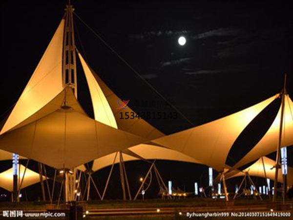 3.因為膜材的自身特性,在燈火的照射下能構(gòu)成艷麗繽紛的美景。景象膜結(jié)構(gòu)它不僅能夠供給遮陽擋雨的空間,更因為這種輕盈優(yōu)美的造型能給人們帶來時髦、輕松的休閑感受。