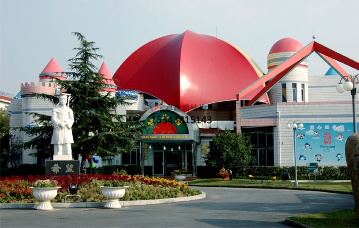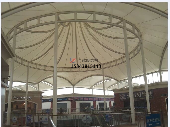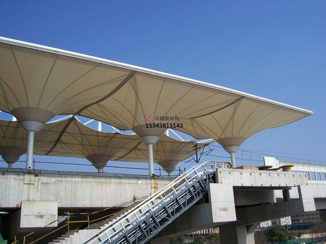 膜結構雨棚屬于軟性材料,本身自動輕,耐高溫、抗紫外線,使用壽命長達15至20年。