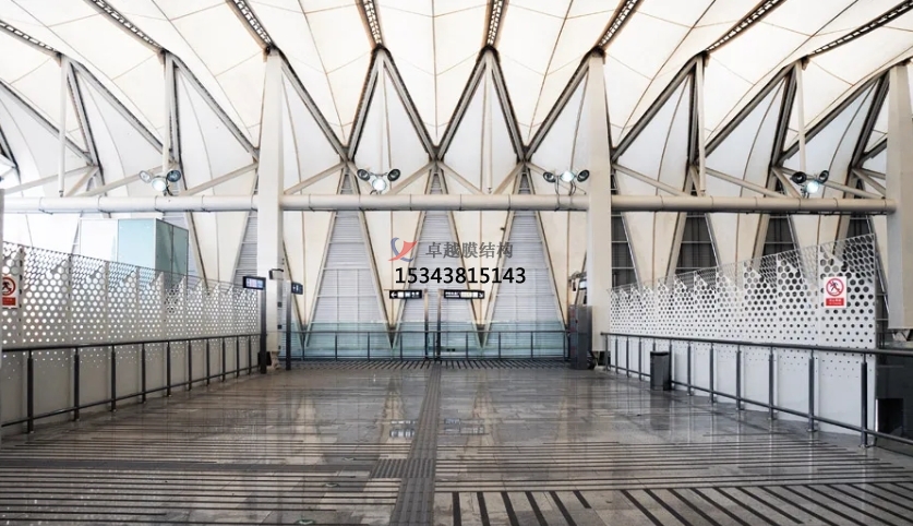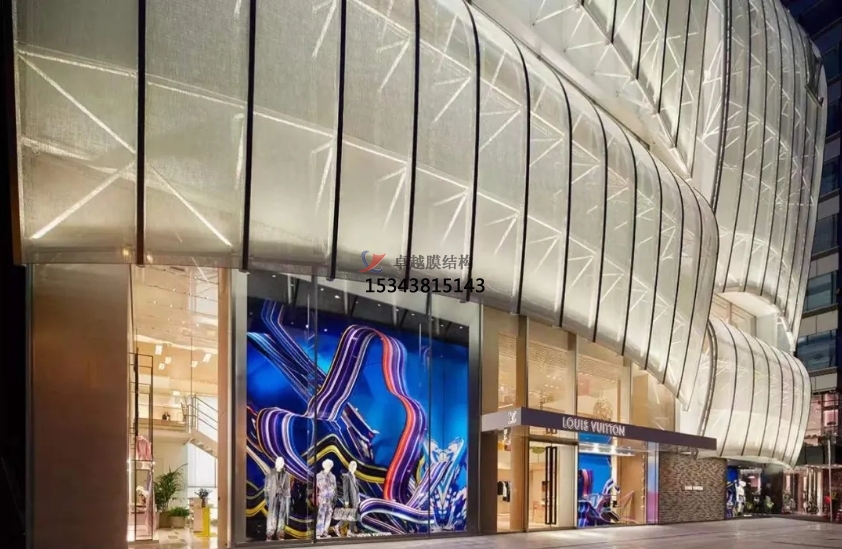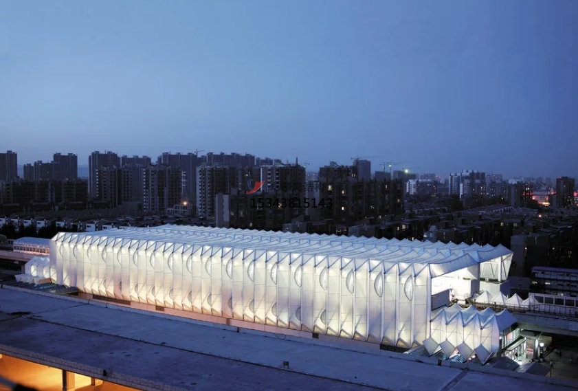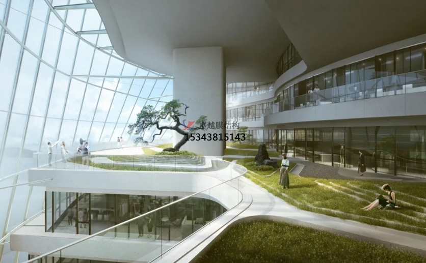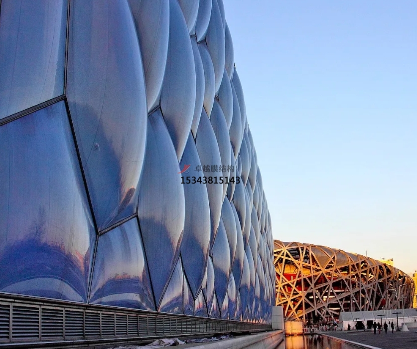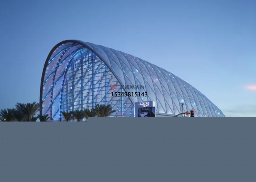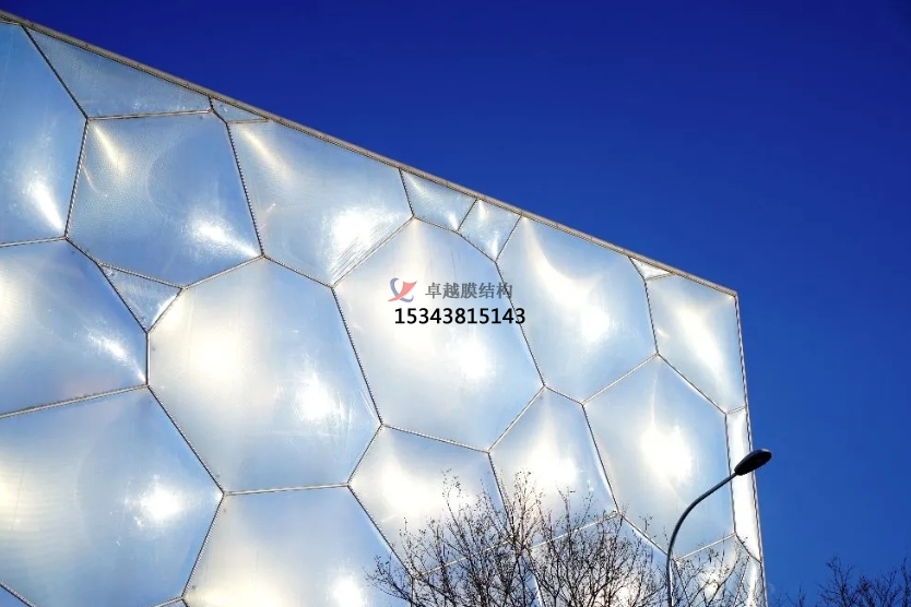 膜結(jié)構(gòu)使得建筑輕盈感十足,膜材料的良好透性使得建筑界面透光而不透視。由于該材料(ETFE)氣枕在陽光底下富有通透感光線可以通過漫射和折射進入界面,讓膜結(jié)構(gòu)建筑呈現(xiàn)出朦朧夢幻之美。