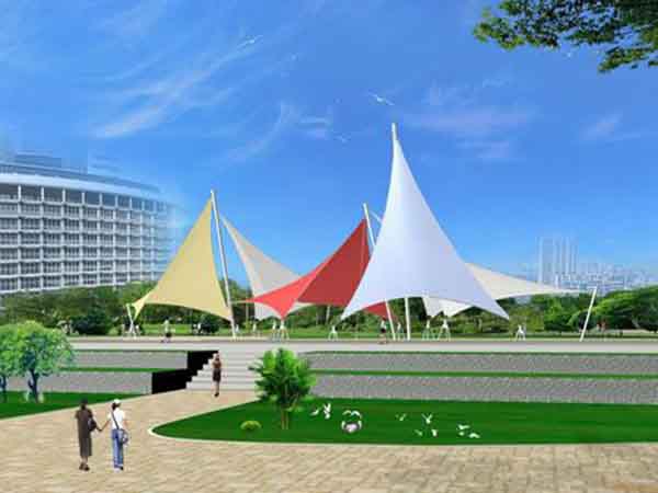 2、景觀膜結(jié)構(gòu)是目前發(fā)展很快的一種新型空間結(jié)構(gòu),是一種效率極高的張力集成體系,可以充分發(fā)揮鋼索的強度與張拉整體結(jié)構(gòu)的空間作用。它通過鋼骨架、鋼索與膜材共同受力形式穩(wěn)定曲面來覆蓋建筑空間,具有高度的形體可塑性和結(jié)構(gòu)靈活性,即通過對膜材內(nèi)部施加一定的預(yù)張力,使其具備了抵抗外荷載能力,從而充當(dāng)結(jié)構(gòu)材料的一種結(jié)構(gòu)體系。我公司先后在池州地區(qū)承接了池州百荷公園景觀、皋城中心廣場景觀、池州萬達廣場景觀小品的設(shè)計施工,簡介如下: