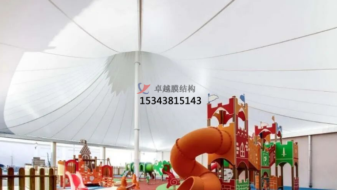 這是一個超450平米的兒童游樂場,于上方覆蓋一把膜結(jié)構(gòu)“大傘",采用白色PVC膜材,大傘中央以一根鋼管支撐,營造了一個明亮開闊無遮擋的安全性空間。
