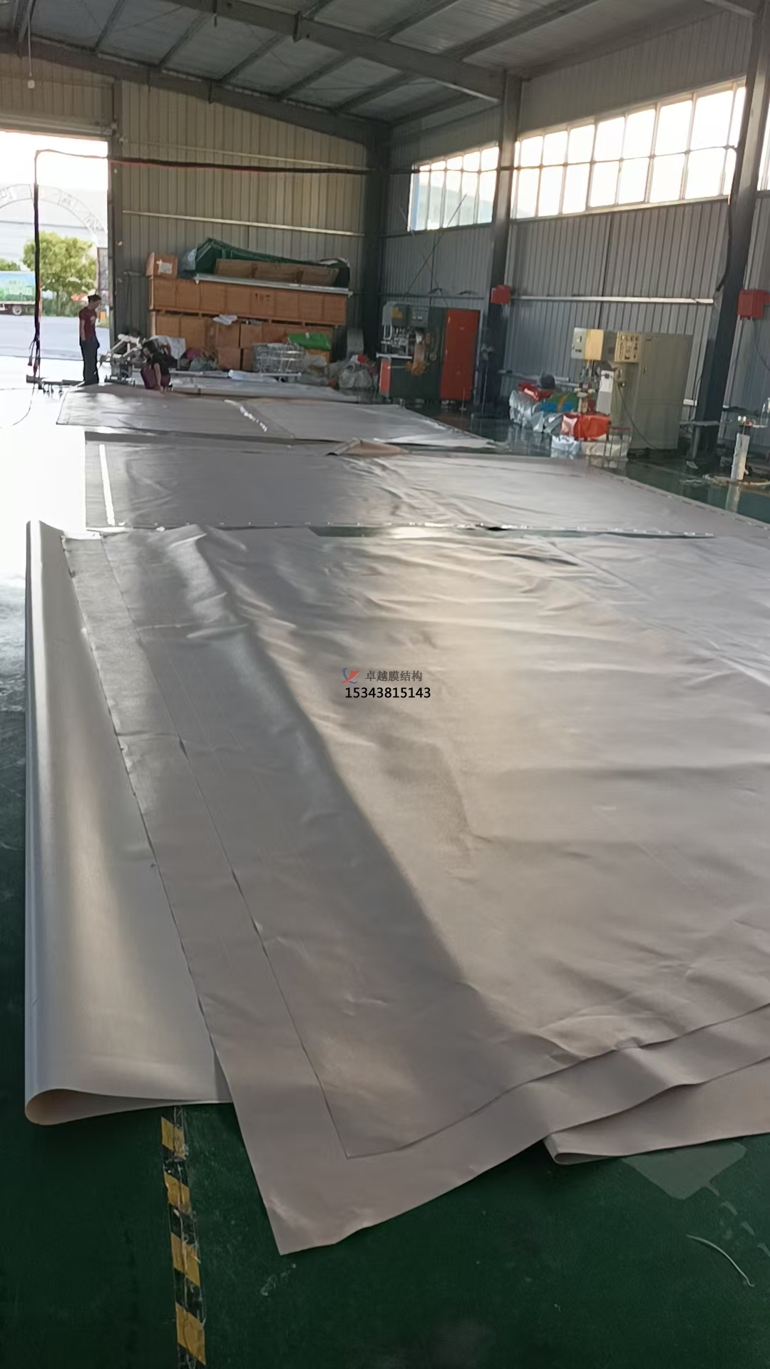 通常,膜面的加工制作包含以下工序:(1)準備工作, 包括技術準備、場地及設備準備、膜材料進場檢測等;(2)放樣、排版與下料;(3)熱合試驗;(4)熱合加工;(5)邊角處理;(6)清洗、包裝。