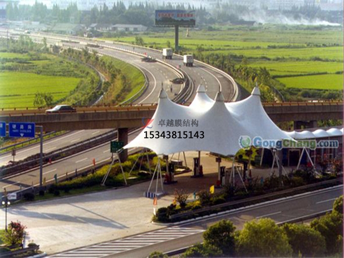 4.膜結(jié)構(gòu)跨度大:膜結(jié)構(gòu)可建成無中間支撐柱的大跨度建筑,一些大型公眾活動場所,收費(fèi)站館,要求室內(nèi)形成無立柱,大面積的開闊空間,這種建筑形式特別適合采用膜結(jié)構(gòu)的屋頂。因?yàn)閱挝幻娣e的膜很輕,大大減輕了骨架的承重。