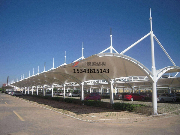 二,膜結(jié)構(gòu)建筑頂部封板采用PVC/PVDF/PTFE/ETFE膜布制作,與建筑整體骨架用壓條鉚接固定,耐酸堿腐蝕,有足夠強(qiáng)度對(duì)棚內(nèi)車(chē)輛起到保護(hù)作用;