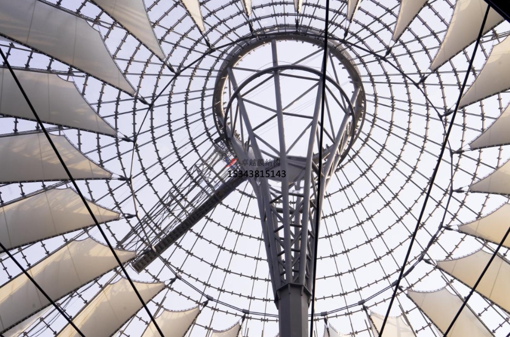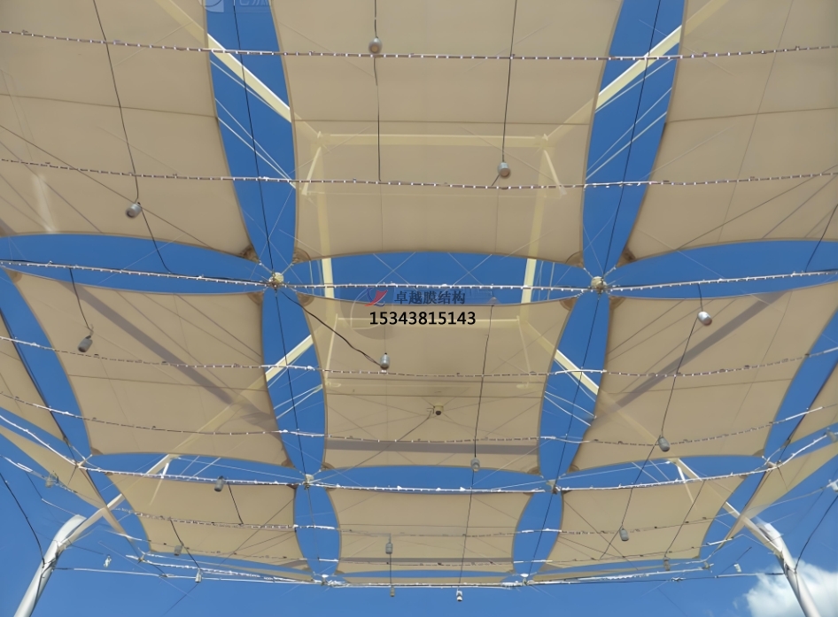 支撐體系則包括拉索、桅桿、拱等結(jié)構(gòu)部件。拉索如同整個結(jié)構(gòu)的 “筋骨”,通過合理布置,將膜材張拉至預(yù)定形狀,為膜材提供穩(wěn)定的支撐力。桅桿和拱等作為主要的豎向或曲線支撐,與拉索協(xié)同工作,共同確定膜結(jié)構(gòu)的空間形態(tài)。其原理基于力的平衡,利用膜材的張力和拉索的拉力相互作用,使整個結(jié)構(gòu)處于穩(wěn)定的受力狀態(tài),如同一張被精心張緊的巨型 “織物”,在風(fēng)中展現(xiàn)出獨特的力學(xué)美感。
