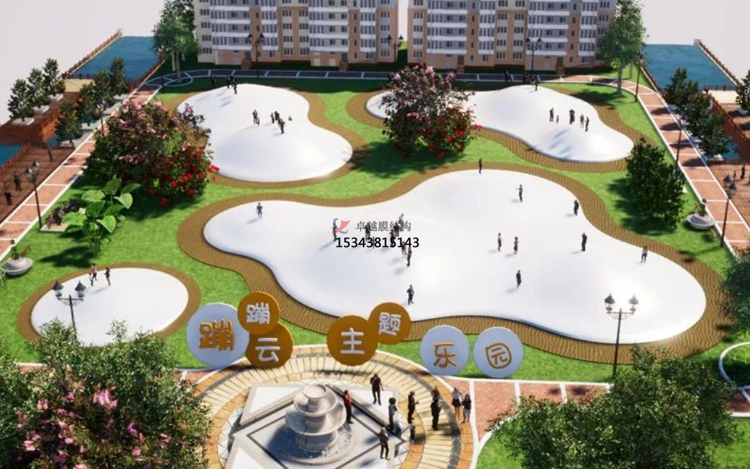 蹦蹦云的造型具有一定的吸引力。整體可以設(shè)計成單球、雙球、多球等錯落分布,視覺上帶給人一定的沖擊。在顏色選擇上也可以選擇不一樣的顏色,與周圍環(huán)境區(qū)分開,更突出玩耍設(shè)備帶來的吸睛效果。