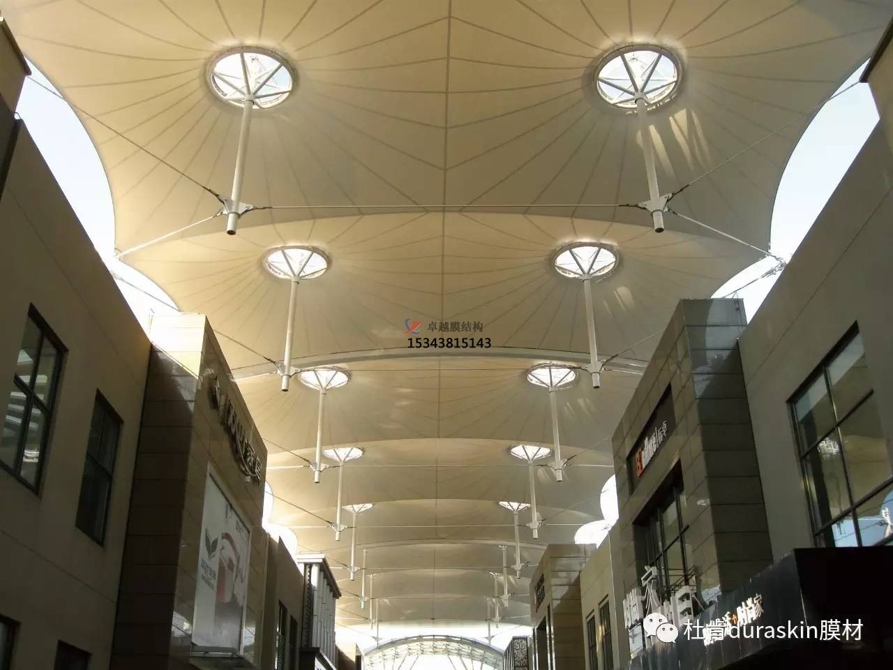 建筑入口使城市公共空間與建筑空間相鄰的界面,成為城市空間的組成部分。它是人們視覺最先接觸的部分,因此,除了功能以外,還應(yīng)有很強(qiáng)的標(biāo)識性,并能體現(xiàn)建筑的個性,是建筑環(huán)境和城市景觀的重要組成部分。由于膜結(jié)構(gòu)自然的曲線美是其他結(jié)構(gòu)類型無法比擬的,故成為近來建筑入口及屋頂經(jīng)常采用的形式。