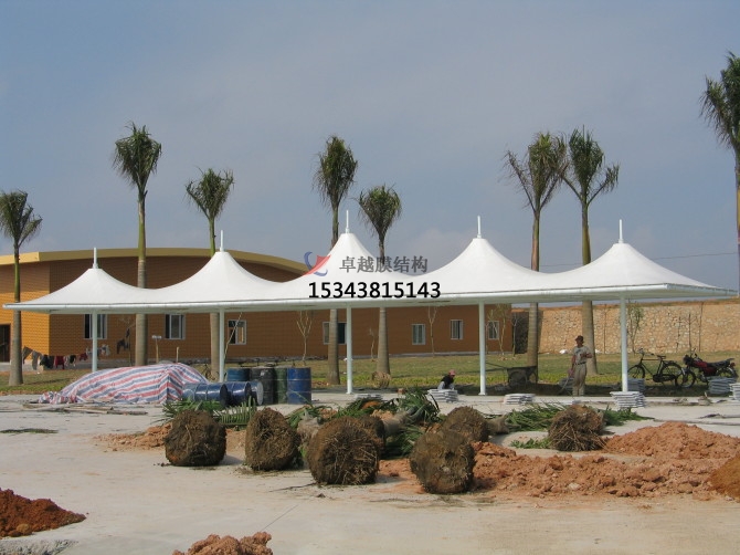 某看臺工程采用張拉膜景觀,形式新穎、活潑。鋼架與索和膜合理結(jié)合,膜頂平滑過渡,結(jié)構(gòu)美觀、輕巧、整體造型相互輝映,自具一格。以下介紹的是該張拉膜景觀工程的設(shè)計步驟及準(zhǔn)則,為以后工程的設(shè)計提供了參考。