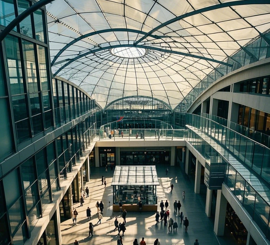 在大型商業(yè)廣場(chǎng)的廊道或大廳頂部,常能見(jiàn)到膜結(jié)構(gòu)穹頂與天幕的身影。以往,實(shí)現(xiàn)自然采光多依賴(lài)陽(yáng)光板或鋼化玻璃,然而陽(yáng)光板易老化,鋼化玻璃自重過(guò)大且存在安全隱患。膜結(jié)構(gòu)的出現(xiàn)改變了這一局面,PTFE 及 ETFE 膜材透光性佳、自重輕、安全性高,尤其是 ETFE,其高自潔、高透光特性,讓穹頂天幕在白天引入充足自然光線,節(jié)省照明能耗,夜晚在燈光映照下,又營(yíng)造出如夢(mèng)如幻的氛圍,為顧客帶來(lái)獨(dú)特的購(gòu)物體驗(yàn)。